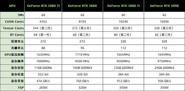 为了查询方便,笔者将这几款显卡的核心参数列出,可以看到GeForce RTX 3080 Ti与GeForce RTX 3090的核心参数非常接近,相差的两个SM单元,也就是1组TPC,256个CUDA。其实在实际应用中来讲差距并不是很大,最大差别是GeForce RTX 3090相比GeForce RTX 3080 Ti多了12GB的显存,这也是为什么在跑分测试上,两款显卡的分数如此接近的原因。