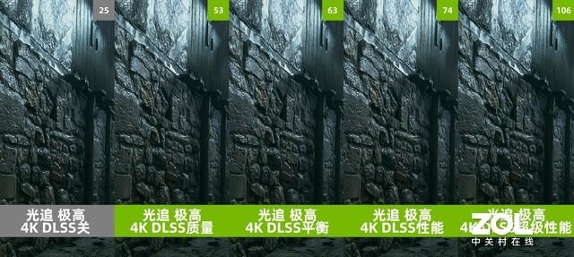 DLSS的对比测试中,首先还是《光明记忆:无限》在这一组对比中,在画面差距上,从DLSS关到DLSS性能依旧看不出什么变化,但是在超级性能模式中,墙壁的清晰度以及轮廓都有所下降。