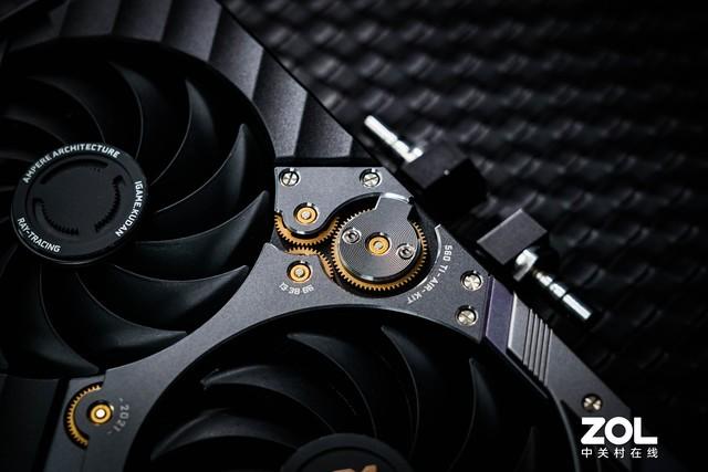 卡面右侧线条及凹凸起伏较多,并标有年轮和“混合冷却”的英文字样,整体表现出厚重的机械感。而散热风扇的logo牌上还有“Ampere”架构、“光线追踪”、“九段”的英文字样。