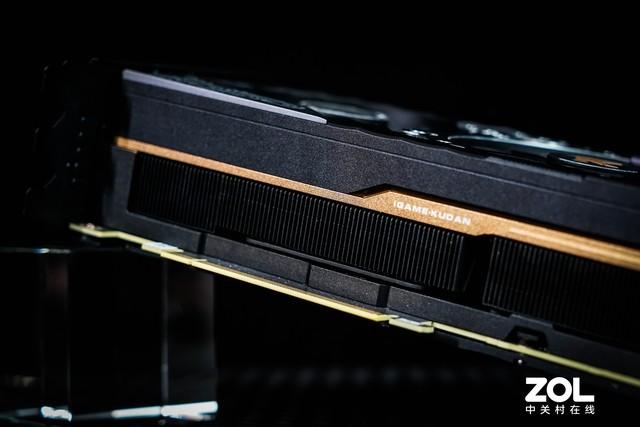iGame GeForce RTX 3090 Kudan(九段)的混合散热系统最为精妙,从显卡侧面也能看出,与我们常见的显卡采用单鳍片散热有所不同。