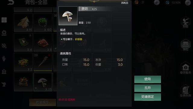 首先来看看蘑菇的属性图,能看到热量、水分、口味都是15,也就是说吃了1个蘑菇能恢复15点的食物值、饮水值、神智值,同时份量是3,代表占据背包的重量是3。
