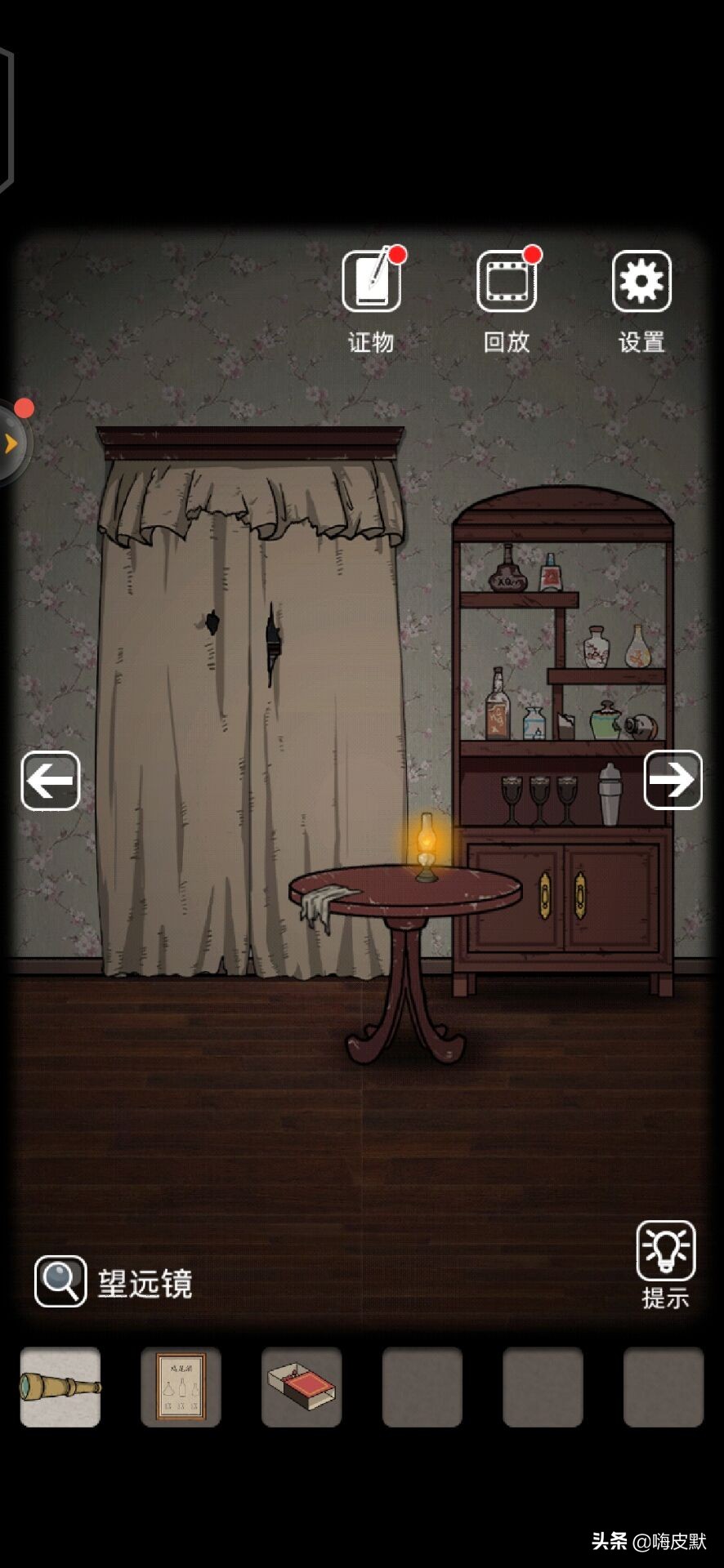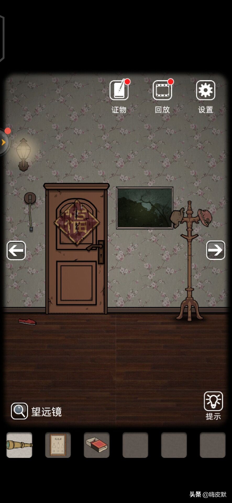 接下来到门这里,点灯的开关后会自动断电,感觉会有鬼钻出来一样,点旁边的画又是一个鬼影还需要你找头箍给她,看来这里又是一个卡点,看看工具栏,有一个显影粉,拿出来会发现向地面撒粉,有脚印出现,随脚印到窗户那里,窗户打开了有闪电人影点窗户,(这里警报,会出现一个大眼)这时就需要望远镜看窗外,会突然冒出大眼,切记,不要无视这个大眼,眼睛上有提示,有个数字4,这时回到门边,点帽子会落下一把钥匙。