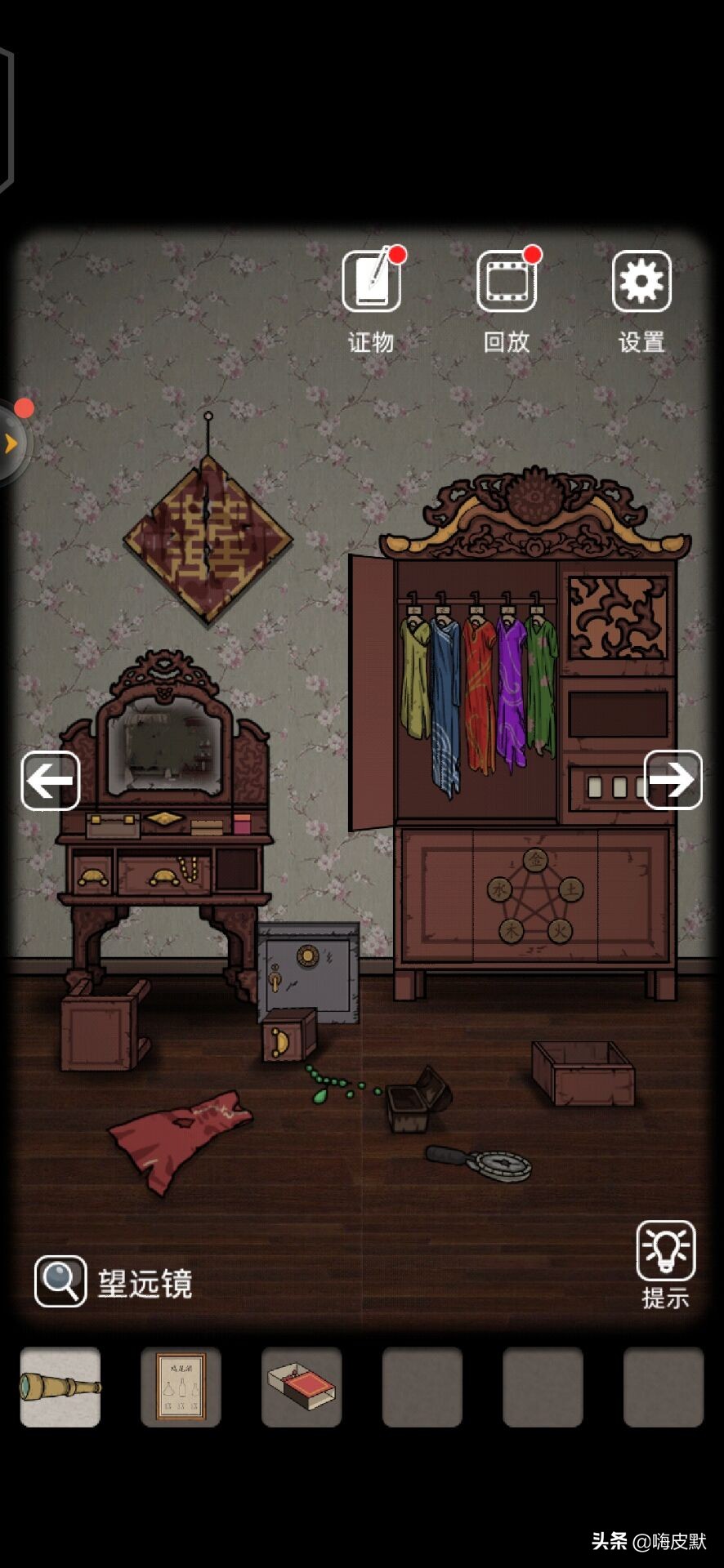 根据提示打开床头柜得到发箍和一本需要字符打开的本子,前面可以知道,发箍鬼画上的鬼,配酒的杯子上顺序打开本子,得到镶嵌物,到梳妆台打开盒子。得到一把保姆房的钥匙。得去保姆房找线索。第二章结束。这里剧情的介绍让我们感觉保姆的各种古怪,在女主人的本子上也写着有。今天就想大家讲到这里,明天继续更新第三章,其实我觉得这些解密游戏重要的是各种细节都不要放过,你就能解出去。要转发的朋友记得评论哈。明天见。
