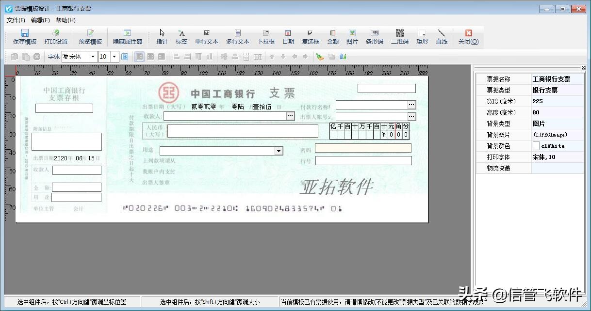 选择了合适的支票打印软件,还要有合适的支票打印模板。制作支票套打模板,需要精确设置套印位置,套用格式及公式,还要对打印位置进行精准的设置,其操作性专业性很强,信管飞票据打印软件支持各大银行转账或现金支票打印,可以根据自己公司使用的支票样式在软件模板库中找到适合自己的支票打印模板,进行开单打印。银行支票有变化的,也可以在亚拓软件官网的模板库中下载最新版的银行支票打印模板,特殊的支票格式也可以定制开发。有了合适的打印模板,就可以批量打印,大力提升工作效率。
