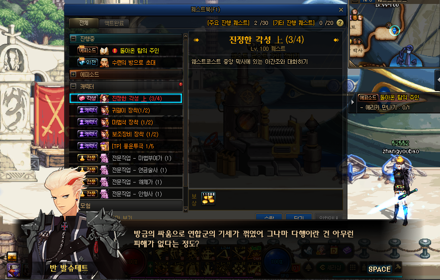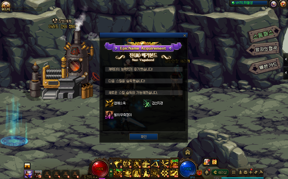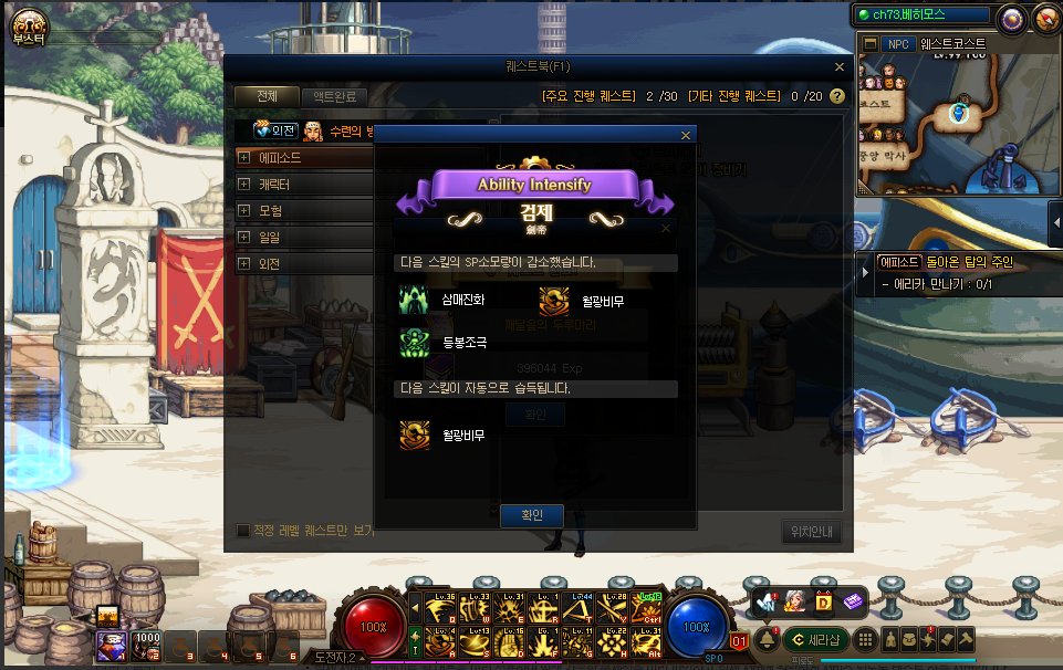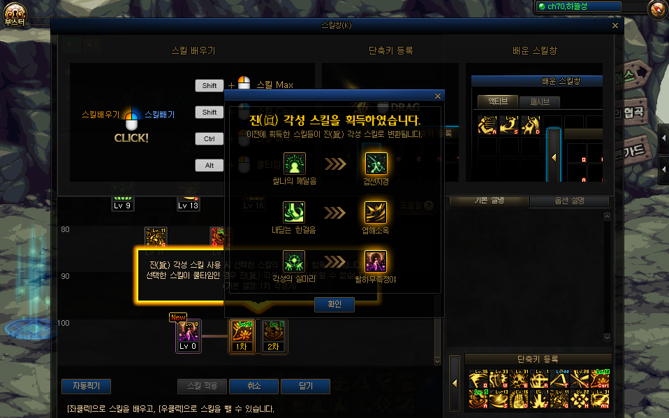- 完成上篇时,获得以下效果. ㄴ 潜力 : 减少1/2觉被动与2觉技能所需的sp,并自动习得2觉技能. ㄴ 天赋 : 减少1/2阶段自觉被动与自觉技能所需的sp,并自动习得自觉技能. ㄴ 95级 - 可以习得[刹那的领悟]技能. ㄴ 习得时增加基础攻击与转职后技能攻击力. ㄴ 95级 - 可以习得[一步之遥]技能. ㄴ 习得时增加基础攻击与转职后技能攻击力. ㄴ 100级 - 觉醒之机. (外传 : 自觉之机) ㄴ 习得时可以自行选择增加1觉或者2觉技能攻击力.