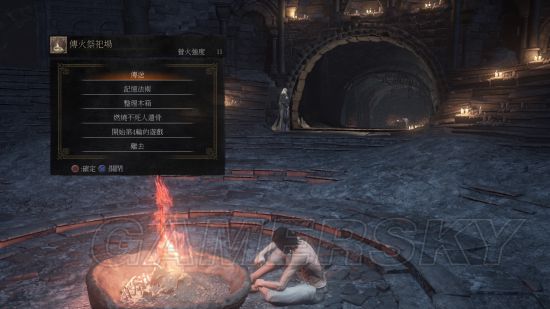 所有营火都提供传送、法术记忆、仓库功能,只有祭祀场营火提供燃烧不死人遗骨的服务【增强原素瓶回复量】,流程中能把原素瓶强化到+10。通关字幕后没有马上进入下周目的,则在祭祀场营火进入下周目。