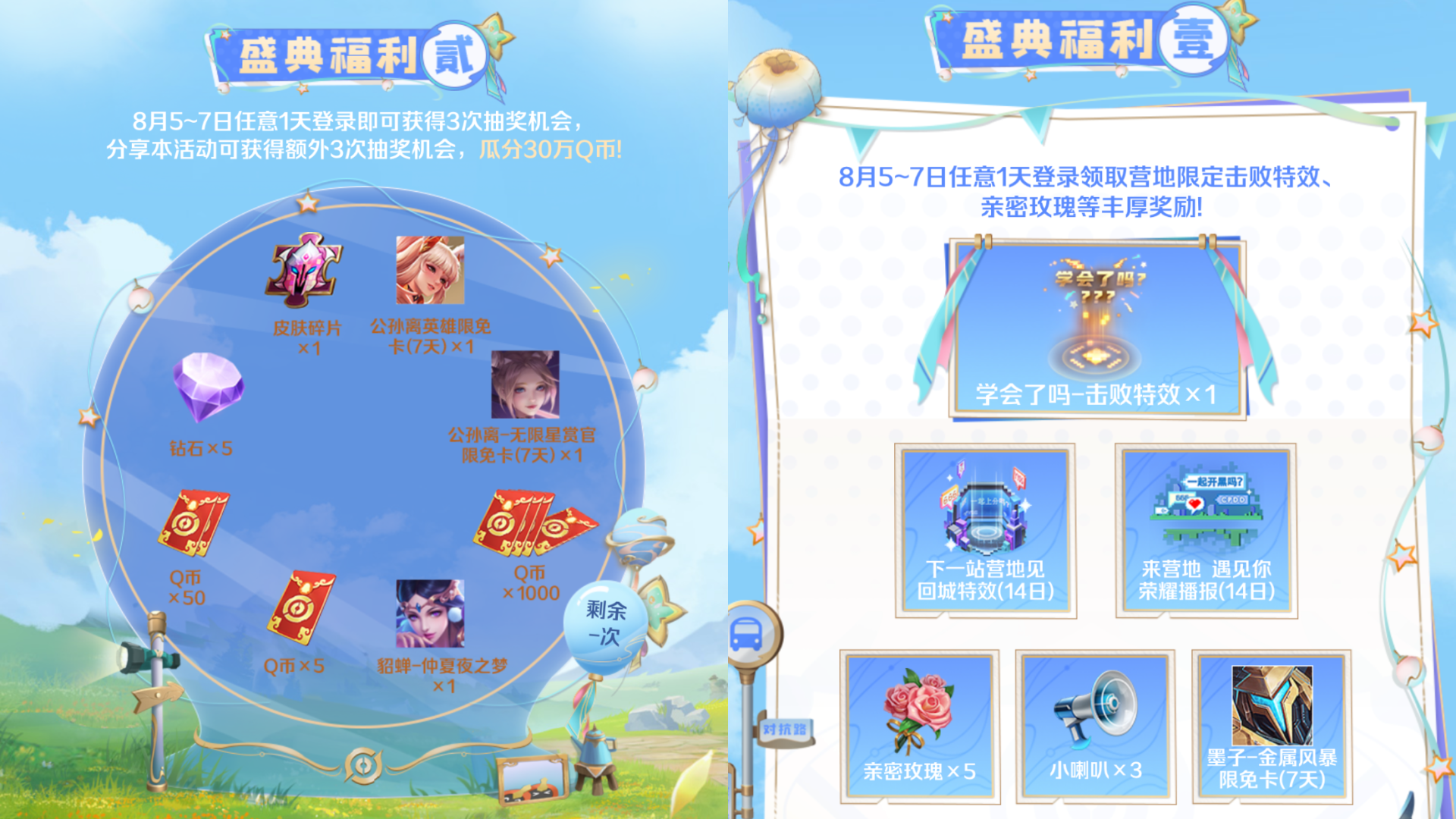 另外还有一些新的福利,如下图所示,在8月5号到8月7号这几天,玩家只要登录游戏就可以获得三次抽奖机会,抽奖有概率抽到永久皮肤和Q币,永久皮肤是貂蝉的仲夏夜之梦,Q币最多一千,最少5个,虽说抽到永久皮肤和Q币的概率不大,但是活动是完全免费的,所以活动还是非常值得参与的。
