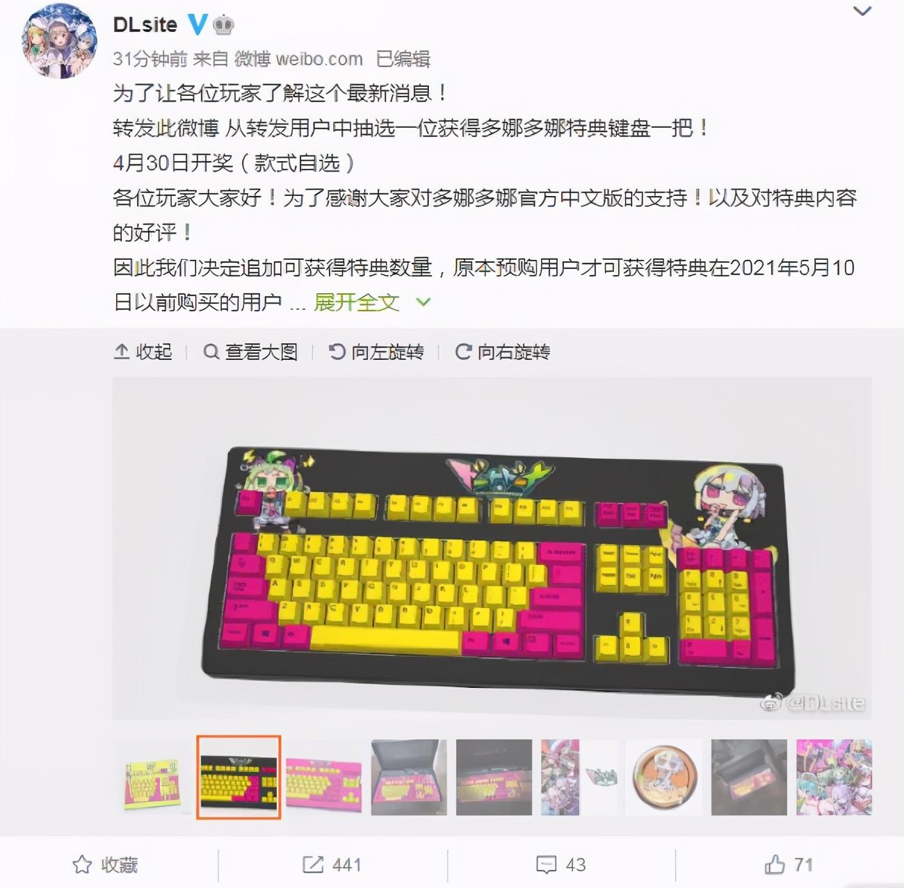 为了保证抽奖的公平和预购玩家的利益,官方表示追加设计了两个不同颜色款式的键盘供购买用户抽选。第一把抽选的键盘只有预购游戏的玩家才可以进行抽选,追加的颜色版本特典键盘可以供所有预购和5月10日前购买并申请了特典的玩家抽选。也就是总共四把多娜多娜主题限定键盘会在抽奖池中,只要在5月10日以前购买的并申请的玩家都有几率可以获得全球限定四把的键盘。感兴趣的玩家都可以试试看,万一抽中了呢?