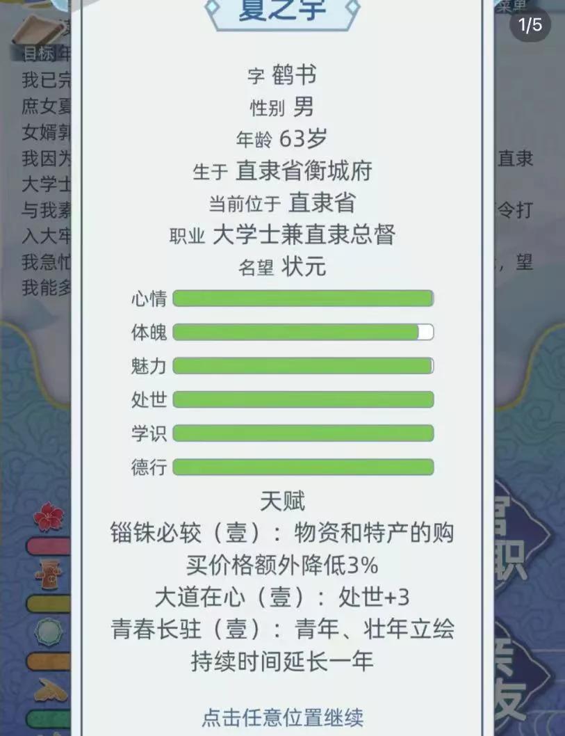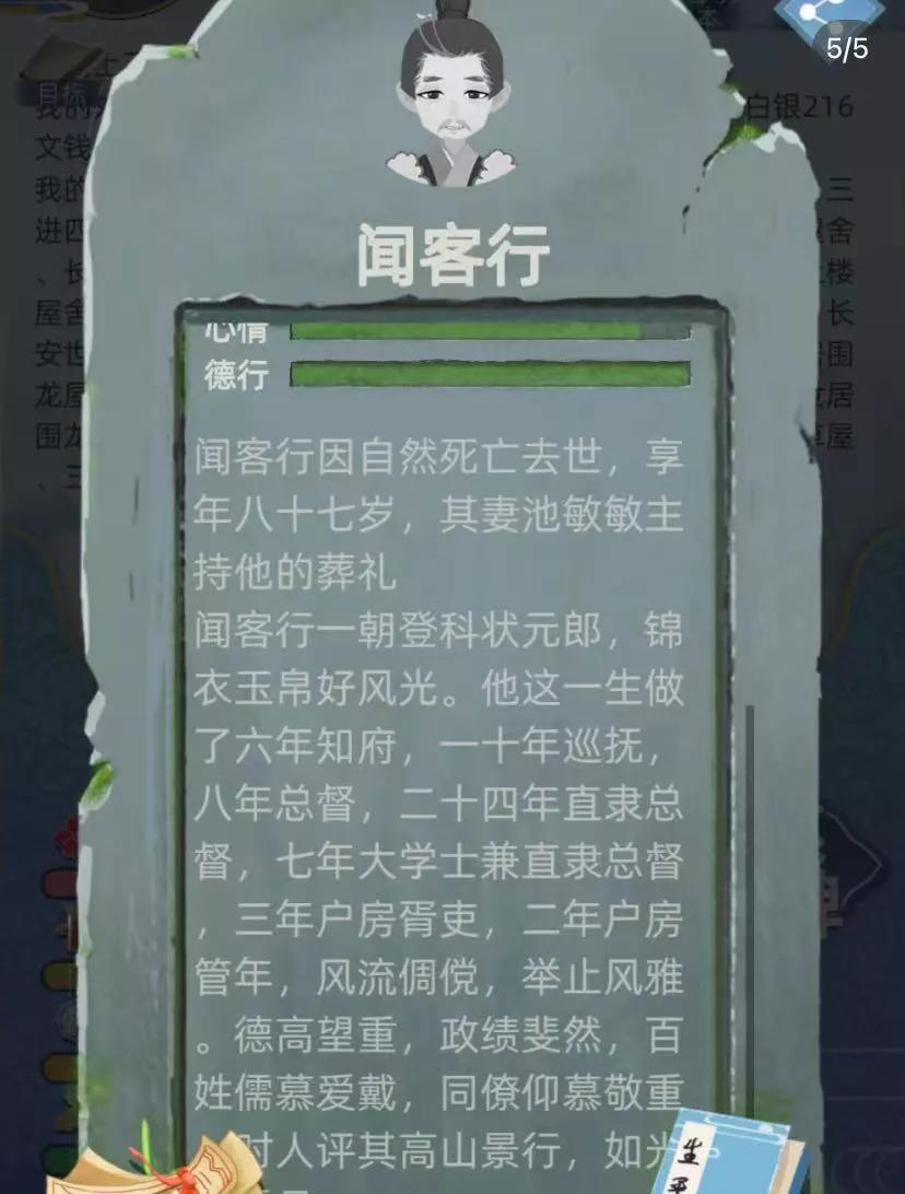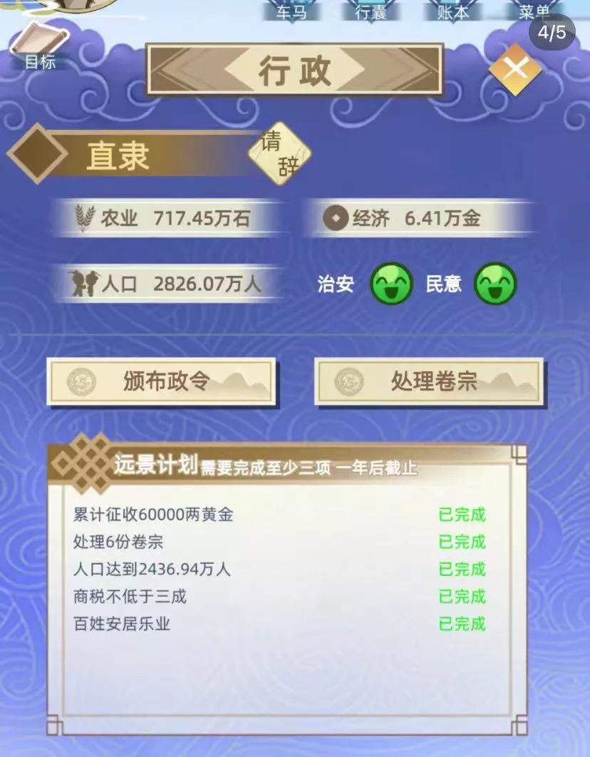 做官做官每年都有政绩的要求,比较难的是百姓安居乐业,政绩要求的界面有两个小表情,当这两个表情都绿了就表示安居乐业达成了。到任后没有发布要求也要先加强治安管理,然后治安这个表情就会变绿。然后在满足其他要求的前提下交叉选择发展农业,发展经济,民意的表情就会慢慢变绿(需要一个过