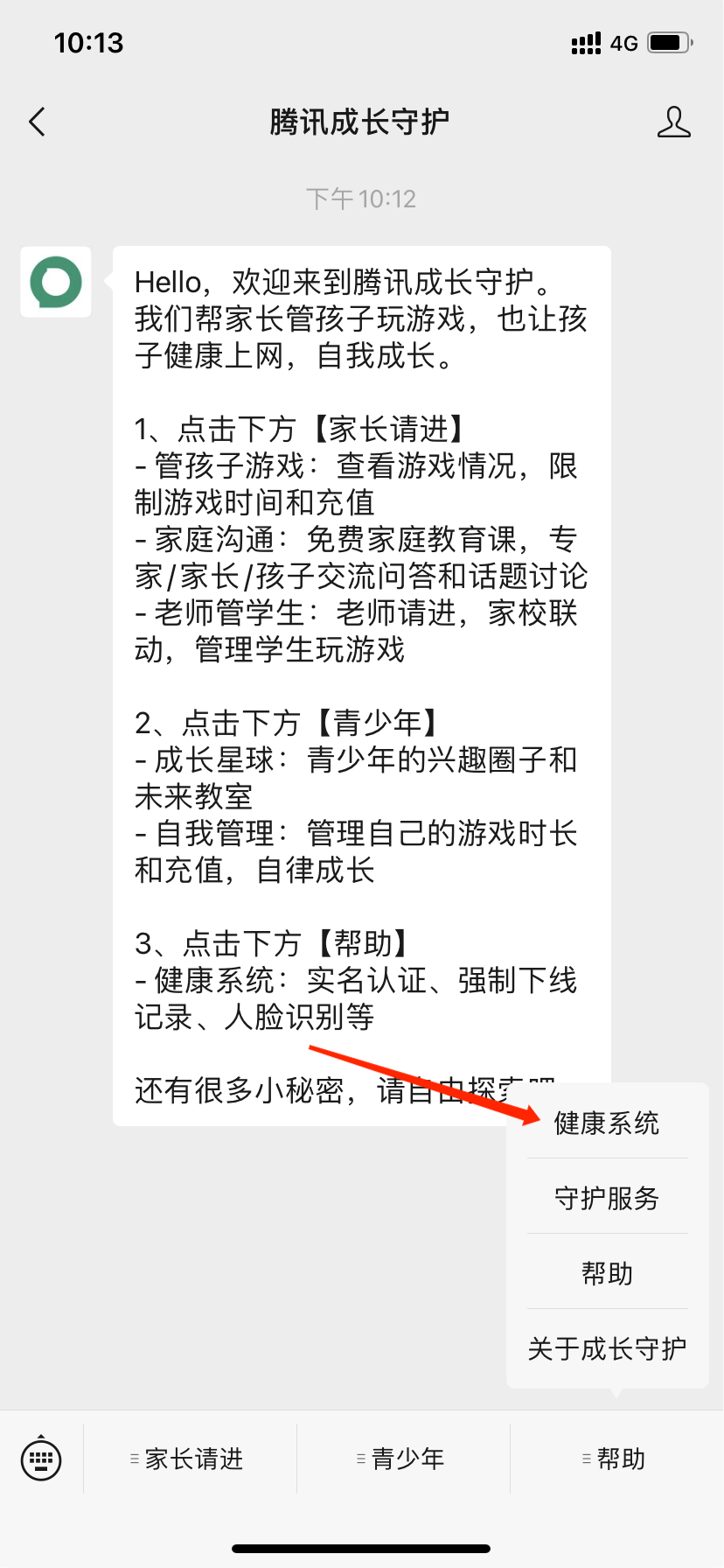 第二步:当我们进入腾讯成长守护平台发消息界面后,我们点击右下角的帮助,在弹出的界面框中我们选择健康系统。