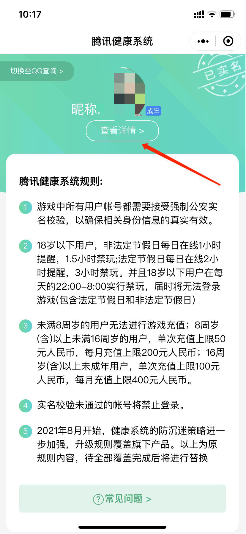 第四步:进入实名认证查询后,会显示我们微信所绑定的信息,想要确定是不是自己的实名信息认证,我们可以点击查看详情,这里小编已经显示成年了。