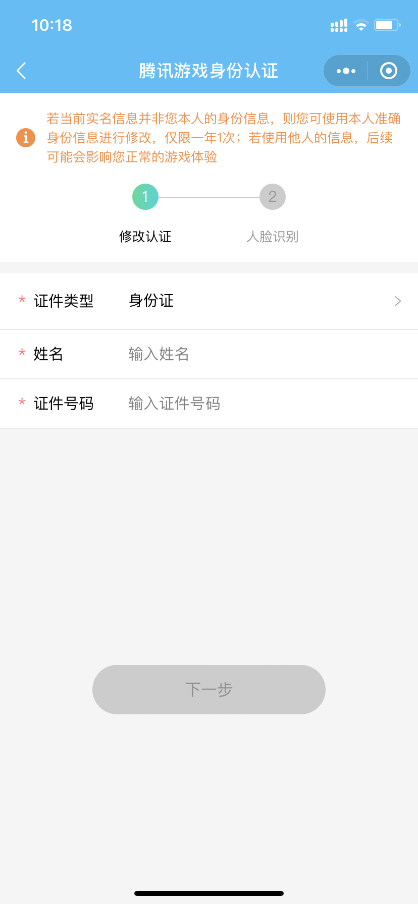 第六步:这里我们距离成功也就差最后一步了,输入自己的身份信息然后再进行人脸识别就好了,不过我们需要注意的是上方提示,修改身份信息仅限一年1次,所以小伙们不要胡乱修改哦,以免影响后期正常的游戏体验。