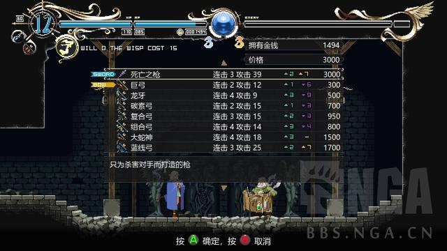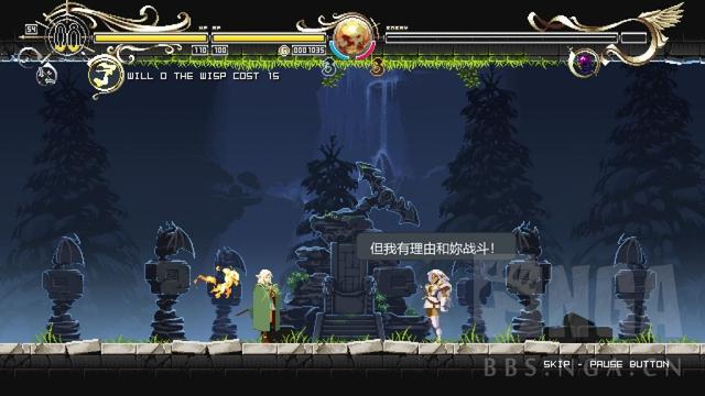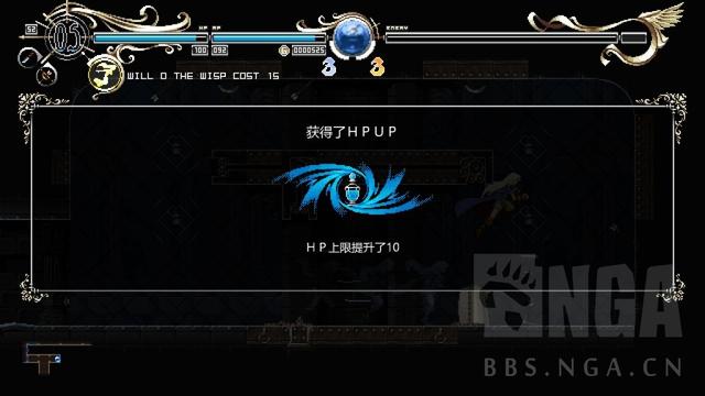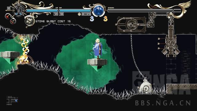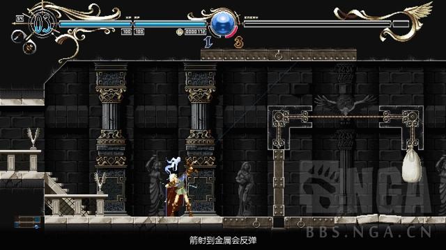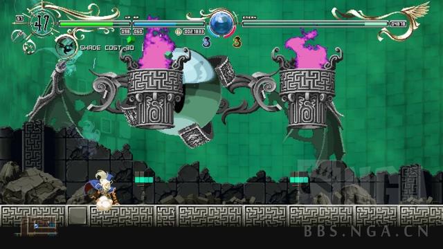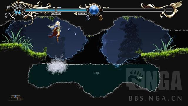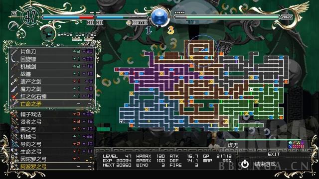 上方的两个条目是血条和蓝条,血条下方是当前使用的主武器&弓箭&魔法:血条无法自动回复,只能靠3级精灵或者购买药品补给,而蓝量则可以随时间缓慢恢复&药品补给&同属性充能、右上是敌人BOSS的血量、屏幕左侧是装备栏——上下方分别是主武器和弓箭,右侧是地图,可以看到是非常典型的恶魔城风格。