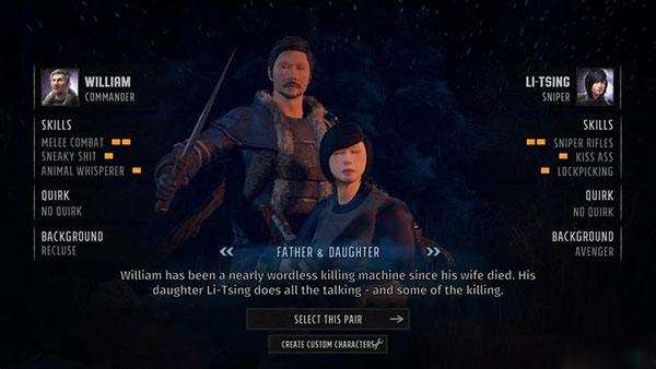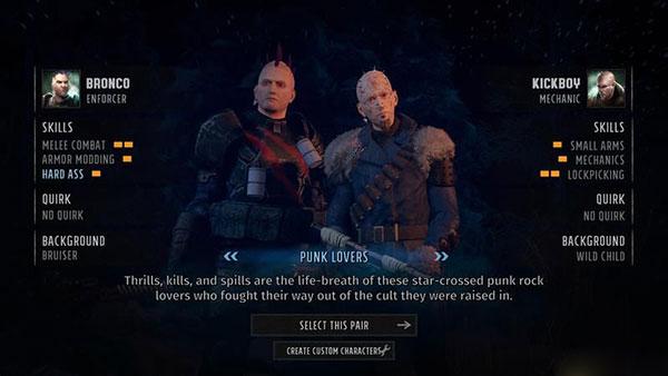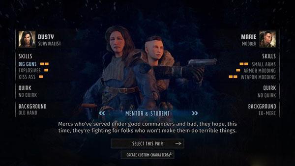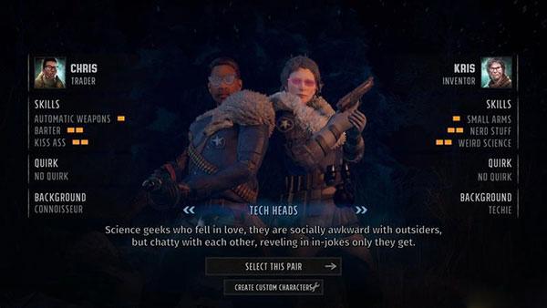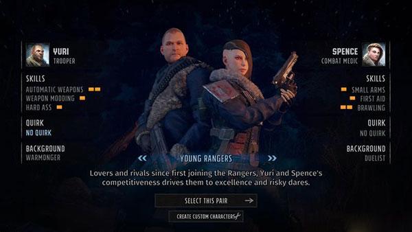 共有5个双人组初始角色供玩家选择。年轻的游骑兵yuri擅长自动武器、武器改装以及利用强硬质态威逼他人(hard ass鉴定)。spence擅长轻装甲、急救以及格斗(赤手空拳)。注意quirk指特殊的怪癖,会带来某些增益或者弱点。