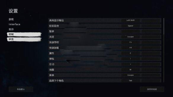攻击/交互——鼠标左键移动——鼠标右键结束回合——空格键打开/关闭菜单栏——Esc快速存档——F5快速读档——F9属性——C背包——I日志——J地图——M旋转镜头——Q/E