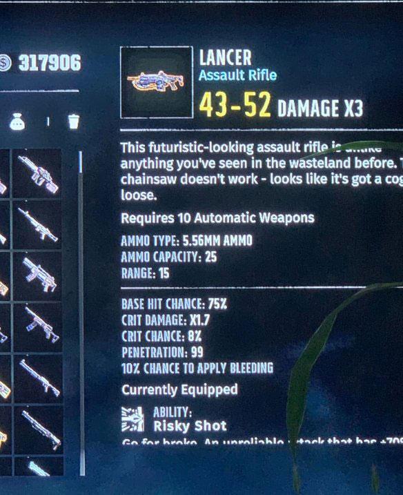 突击步枪突击步枪是全能型武器,各项平均没有亮点(全都不能型)最菜武器当之无愧。优点是基础命中率高,前期可以用用。穿透射击perk偶尔能发挥一下,5点ap消耗还要移动自己位置,基本不能开第二枪,大多数时不如原地射两梭。敌人掩体效果-25%perk,图一乐,直接射命中率依然堪忧,还得靠侧翼包抄或者大招强制命中,或者近战突脸。连续击同一敌人第二发必暴击的perk不是第二次射击一梭子全暴击,只有第一发必爆。冲锋枪低穿甲低射程高dps,dps大概是突击步枪的1.5-2倍。大前期不好使,因为护甲公式减免率是1-(穿甲÷护甲值),前期很容易被高甲减免绝大部分伤,只能找无甲敌人扫射。后期护甲作用比较小(手枪和霰弹也是低穿甲,同理)而且弹药消耗略高,自动武器流前期建议冲锋枪和突击步枪轮着用。持续扫射perk一轮打出2倍子弹但-35%命中率,超强力技能,命中率高以后好用,前中期要配合狙击perk锁定减敌人闪避率。无掩体时伤害+15%perk,收割时冲脸用,或者用大招时出掩体,打出一轮爆发。