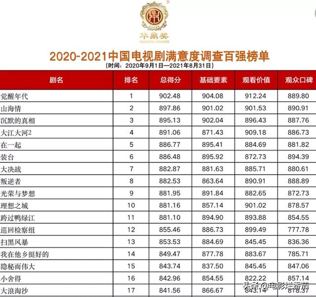 1、中国百强电视剧满意度调查排名百强榜——第一名《觉醒年代》、第二名《山海情》、第三名《沉默的真相》