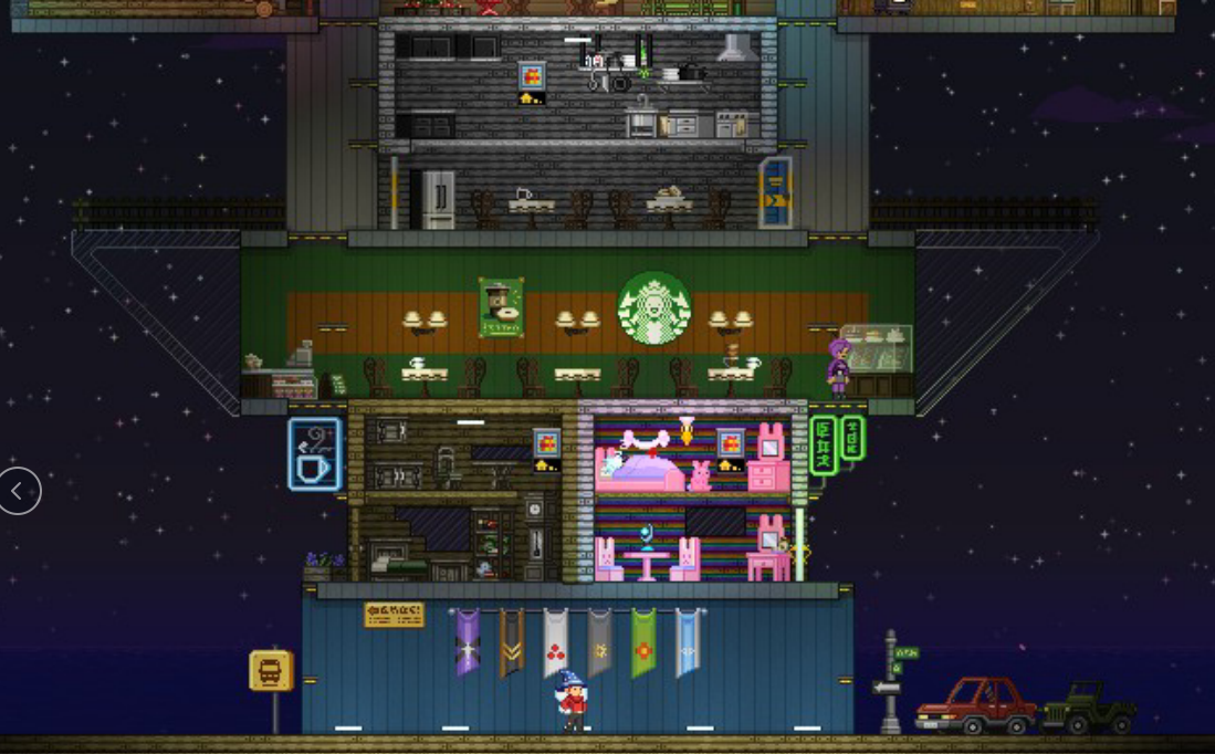 横版沙盒,穿梭在宇宙中,可以探索不同的星球。同时也有挖矿找资源、打怪、抓小精灵、抓蝴蝶等等玩法。也可以建造殖民地,通过个人的喜好装修,建造好甚至可以召唤NPC入住。