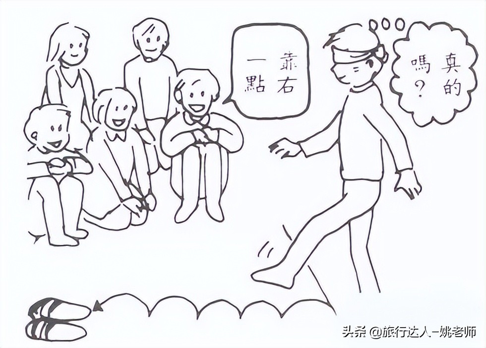 游戏规则:各队轮流派出1人。把拖鞋放在起点前方5步的地方。回到起点蒙眼旋转三次以后出发。能够准确前进5步,第6步穿到拖鞋较多的一组获胜。