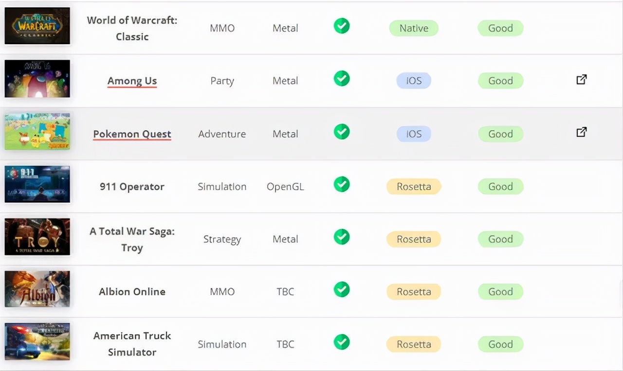 除此之外,根据Apple Silicon Games的统计。在玩家上传(说明有人玩)的568个游戏兼容性数据(包含游戏帧数、玩家的游戏设置等多方面的数据)中,已经有超过400款游戏能够在ARM芯片的MAC上正常体验,其中不乏《博德之门3》《COD:M》《赛博朋克2077》等端游大作、手游以及云游戏。