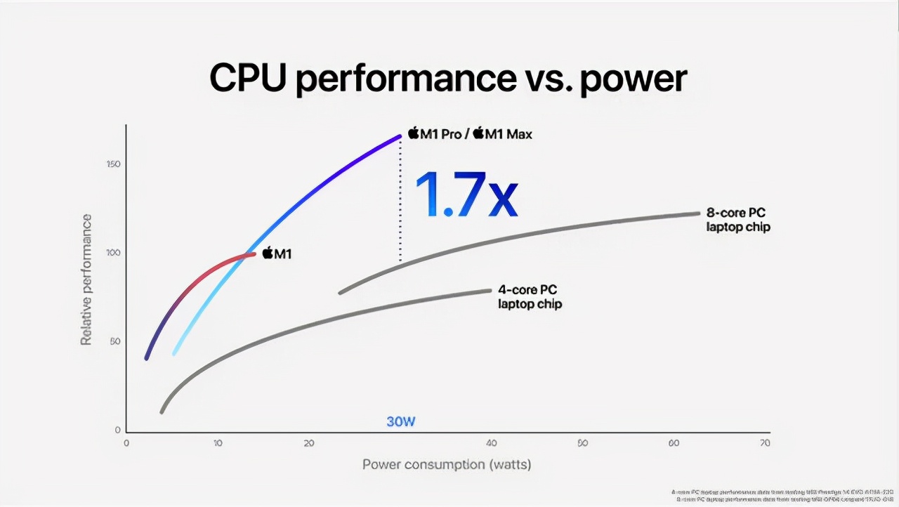 在CPU方面,对比采用i7-11800H,售价13299的微星 GP66 Leopard,M1 Pro和M1 Max的CPU在同功耗下性能是i7-11800H的1.7倍,在同性能下,功耗是i7-11800H的30%。