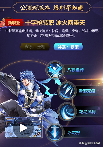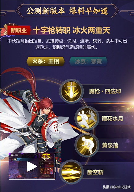 首先,要说的当然是万众期待的新职业了。在这次公测新版本中,新职业正式命名为——十字枪。职业特色为中长距离输出担当,流派分为火系:王相和冰系:寒策。