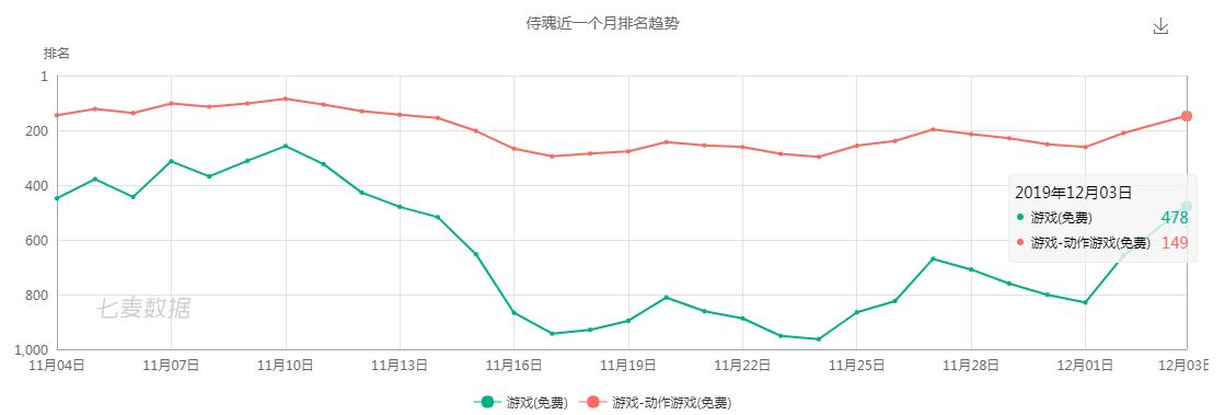 《侍魂:胧月传说》作为腾讯游戏2018年12月推出的手游,虽然是由乐道互动研发,却由原DNF策划“天策”担任侍魂手游的主策划,可见当时对侍魂的期待有多高。游戏上线后的数据也并没有让人失望,根据七麦数据显示,最高到达iOS免费榜第一、畅销榜第三的位置,自游戏上线以来近一月的时间,《侍魂:胧月传说》基本稳定在iOS畅销榜TOP10以内,免费榜TOP40以内。