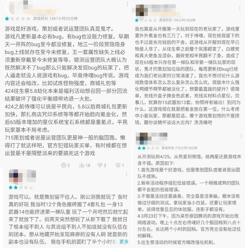 在4月的时候游戏里加入了一个“往生祭”活动,能直接将装备复原到“异化”之前的强化状态,随后又紧接着废除“异化”系统,更改为“劫化”系统(强化失败不掉级,进入劫化状态,不可继续强化),这等于说直接给所有玩家两次白嫖强化的机会,无数欧皇通过此次活动逆袭,使得氪金玩家寒心。在TapTap上对于游戏的评价,大多玩家都认为游戏总体表现还行,但是策划的一些列谜之操作却成功劝退玩家,这也印证了游戏的数据下滑与策划的失误有一定关系。