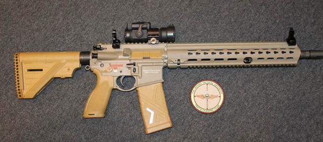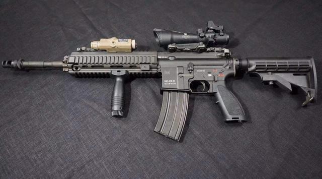 HK416突击步枪已经成为现代特种部队的标志,不管是东方,还是西方特种部队,一般都装备过HK416。它采用与美式AR15自动步枪类似的枪机结构,但它却要比AR系列步枪的性能更加优秀。HK416采用短行程活塞导气式自动原理和滚珠式枪机结构,枪身具备模块化设计,顶部带有皮卡汀尼战术导轨,在战斗时,可以安装各类型号的瞄准镜,枪身下方还可安装M320榴弹发射器或者垂直握把。HK416突击步枪发射5.56×45毫米北约小口径弹药,采用30发北约标准弹匣供弹,每分钟理论射速700~900发,有效射程450米,还根据不同的用途,不同的环境,衍生出多种型号。早期的德军特种部队主要采用G36C型,但现在也开始逐渐换装HK416突击步枪。