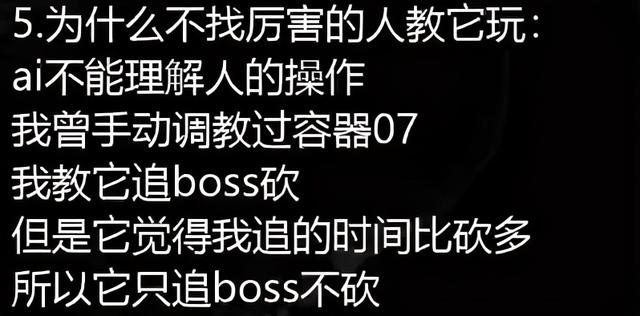 容器7之所以与众不同,主要在于这是Ailec第一次尝试手把手教AI如何战斗。简单来说,他将自己对阵大黄蜂的录像演示给AI,希望它能从中学习到一些操作技巧,结果容器7受到教诲后,不仅没有成长为武林高手,反而立地成佛,具体表现为只追着BOSS跑,靠近后却一刀不砍——可惜大黄蜂不会因此手下留情。
