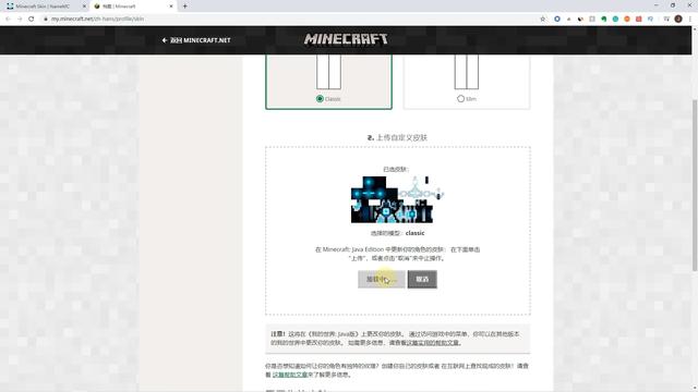 找到自己想要的皮肤之后,如果是你能够正常的登录到Minecraft的官网的话,就可以直接点击这个apply,就会出现这么一个更改皮肤的一个页面了,我们直接点击上传就可以了,当然前提是你能正常的访问Minecraft的官网,如果是不能正常访问的话,那么接下来就是重点啦。
