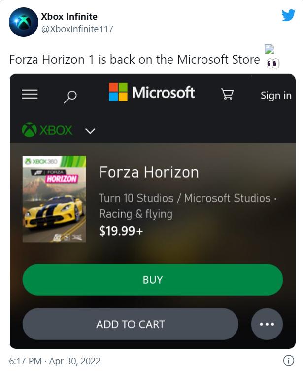 多名用户报告称,初代《极限竞速:地平线》突然出现在了 Xbox 游戏商店,并且可以购买,售价 19.99 美元(约 132.73 元人民币)。