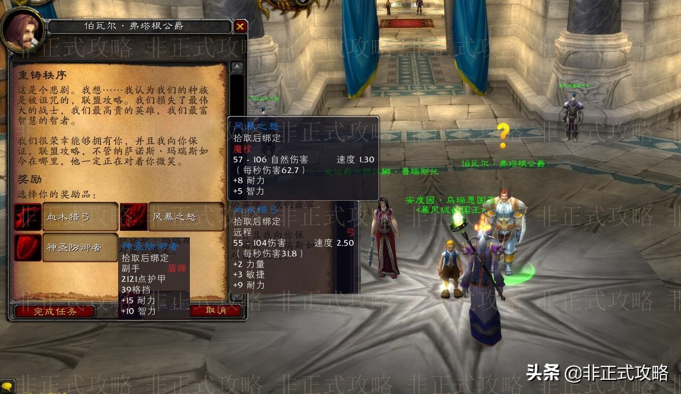 ▶返回暴风城,找伯瓦尔·弗塔根公爵交任务,领取属于你的奖励。这个任务奖励还不错,分别是一个弓,一个魔杖,一个盾牌,三选一。