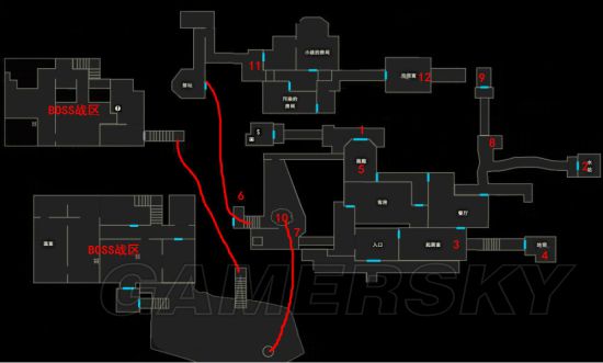 9.回到阁楼可以按按钮放下楼梯。上楼在【7】处桌子上可以找到shou枪和弹药,出门一直往前走在【8】处两个人模前的桌子上还有弹药,不要上楼隔壁房间桌子上有弹药。然后到【9】处上楼梯触发BOSS战。