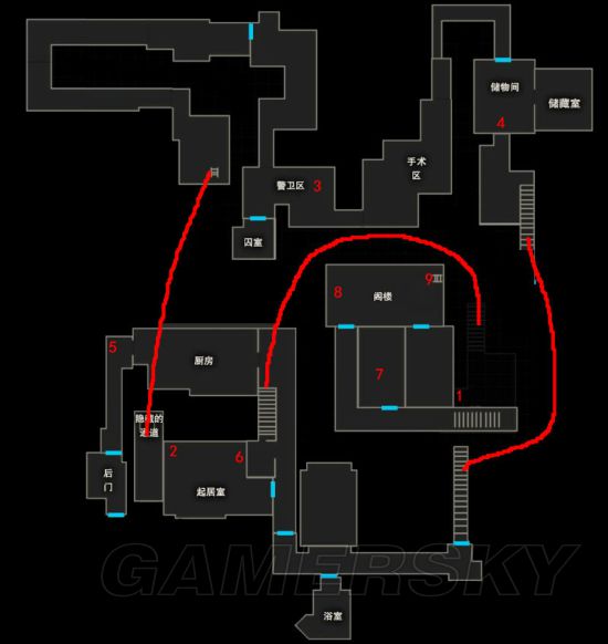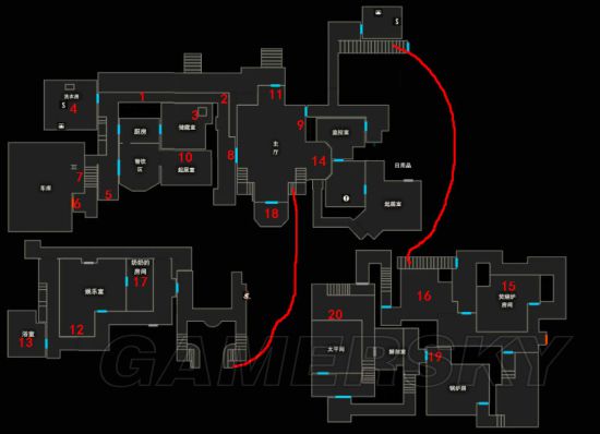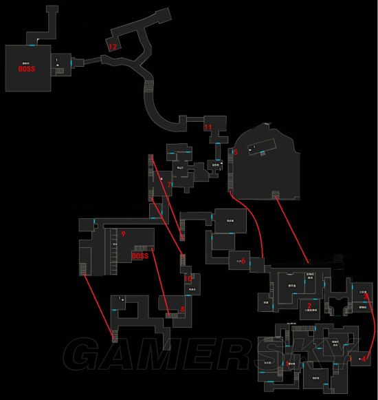 本章为楼层式地图,楼层直接都能用中间电梯【7】或左侧的楼梯来切换,所以就不用红线标示了。
