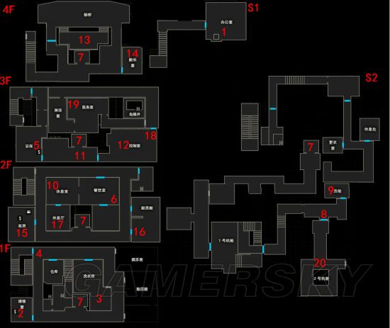 2.到【5】处可以获得录像带,然后用边上的录像机播放。到【6】处蹲下进去看见一堆东西,再到【7】处坐电梯到S2,到【8】处发现开不了门,到隔壁房间【9】处获得腐蚀剂,回到【8】处用腐蚀剂开门,进去兜一圈出来。一路回到电梯返回3F会发生故障,来到【10】处可以爬出窗口,到【11】处发生剧情,再到【12】处调查电脑,然后出门到走廊上触发剧情回到现实。