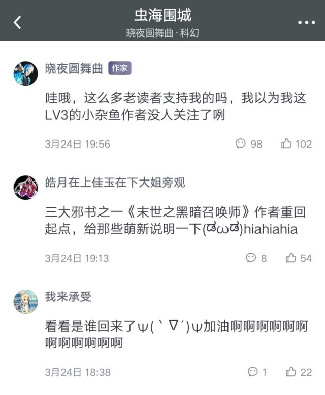 而3月23日,其新书《虫海围城》在起点上线。一开书就被细心的读者发现了,实在是其名声足够响亮。