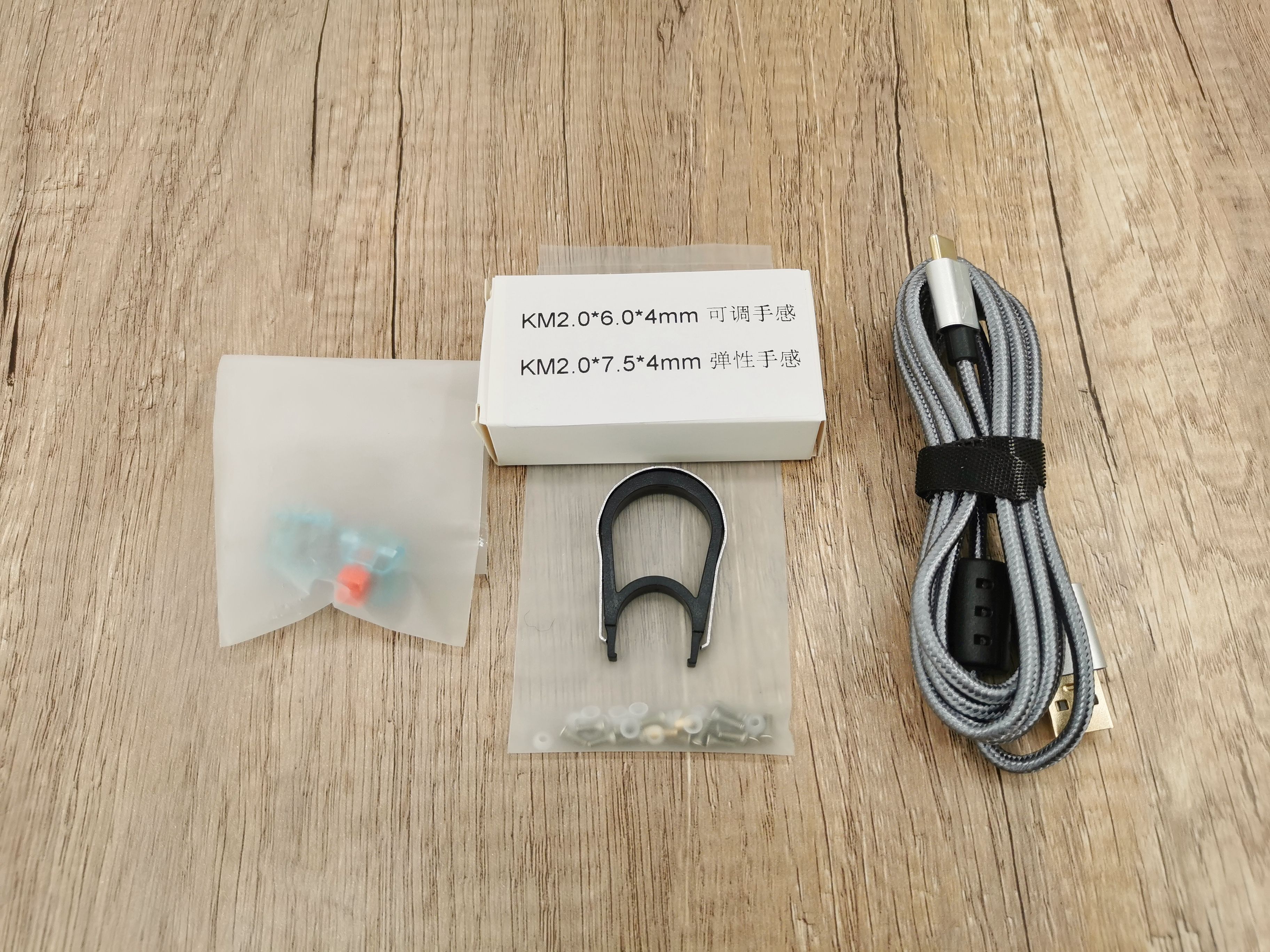 这把键盘支持轴体热插拔功能,配件给的还是蛮丰富的。包含两个用于替换的轴体,一根Type-C数据线,一盒用来调整手感的螺丝胶垫,还有一个拔键器+拔轴器的组合。