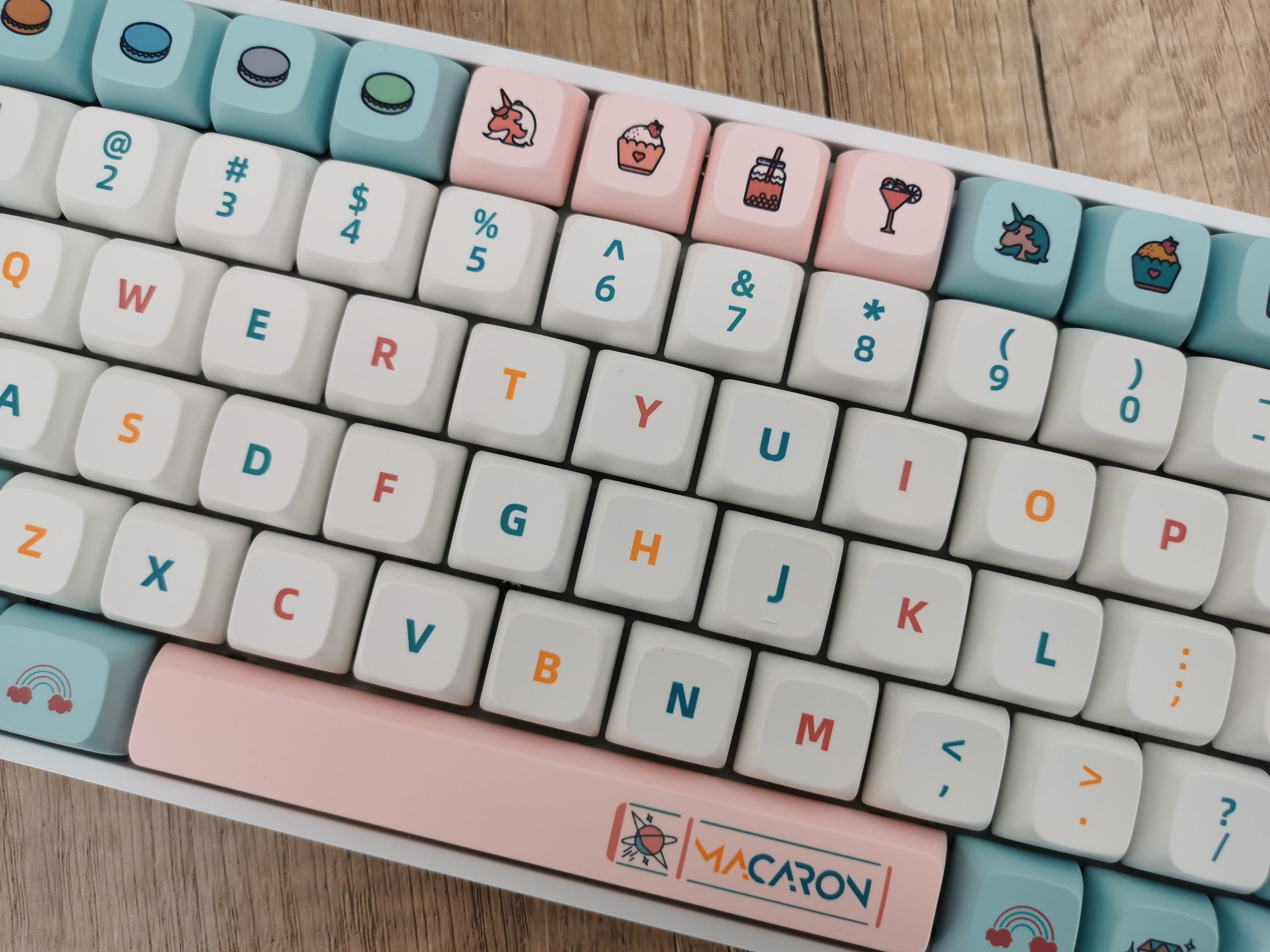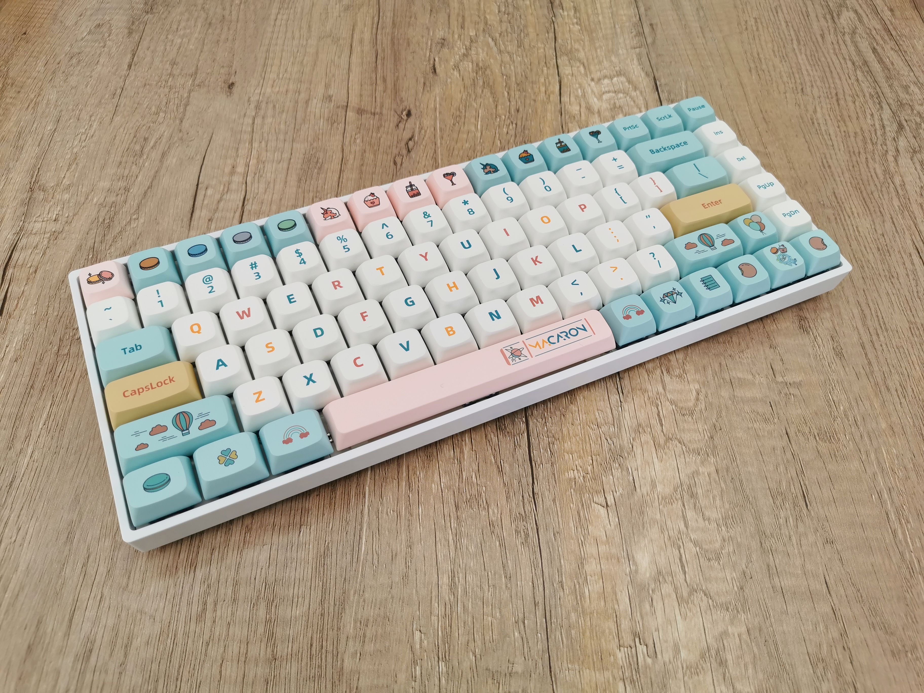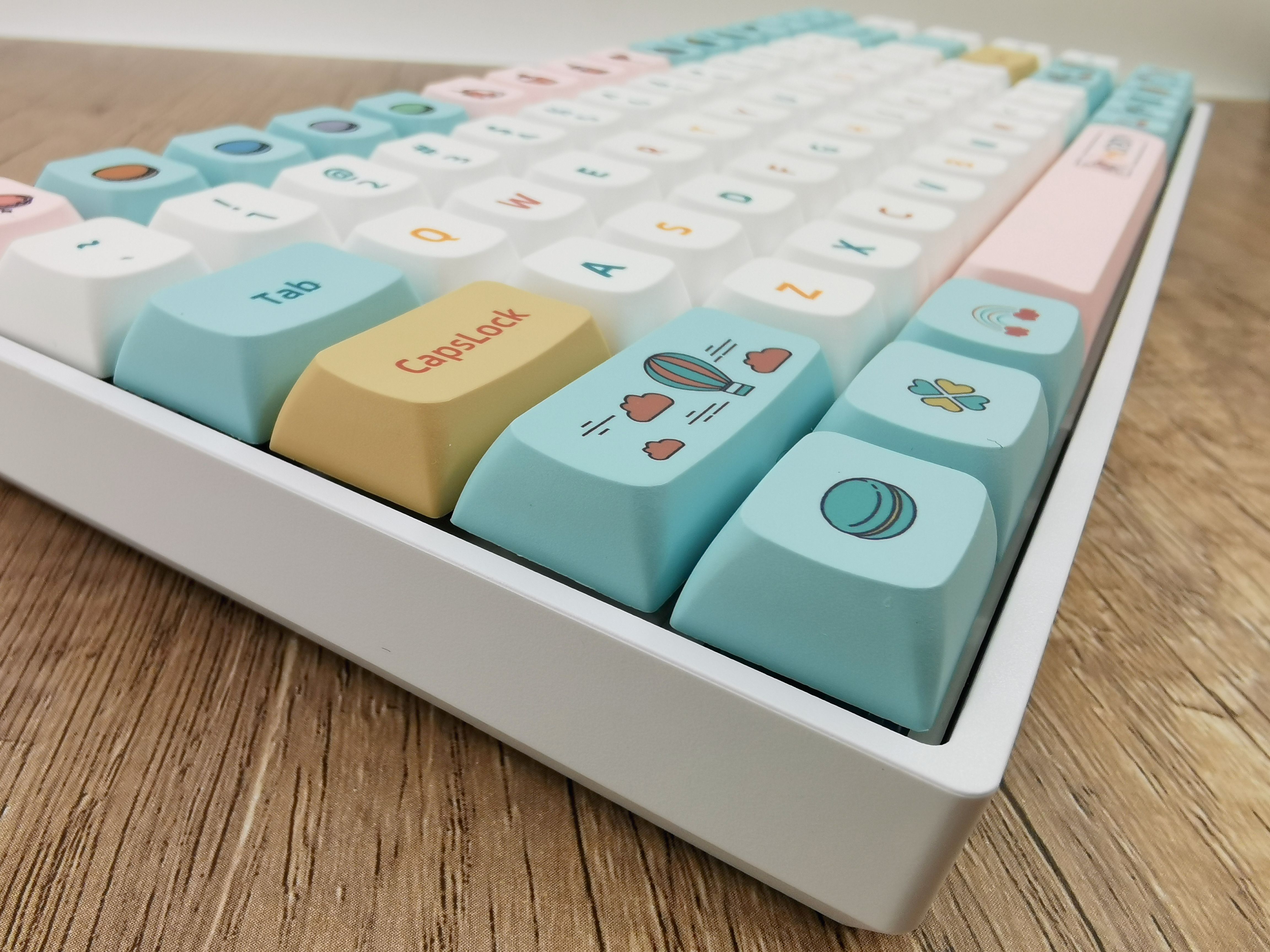 开箱后,直接被这套马卡龙配色的键帽戳中了少女心,这也太可爱了吧!马卡龙咱没吃过,但是第一反应就是想起了小时候吃的各种棉花糖……