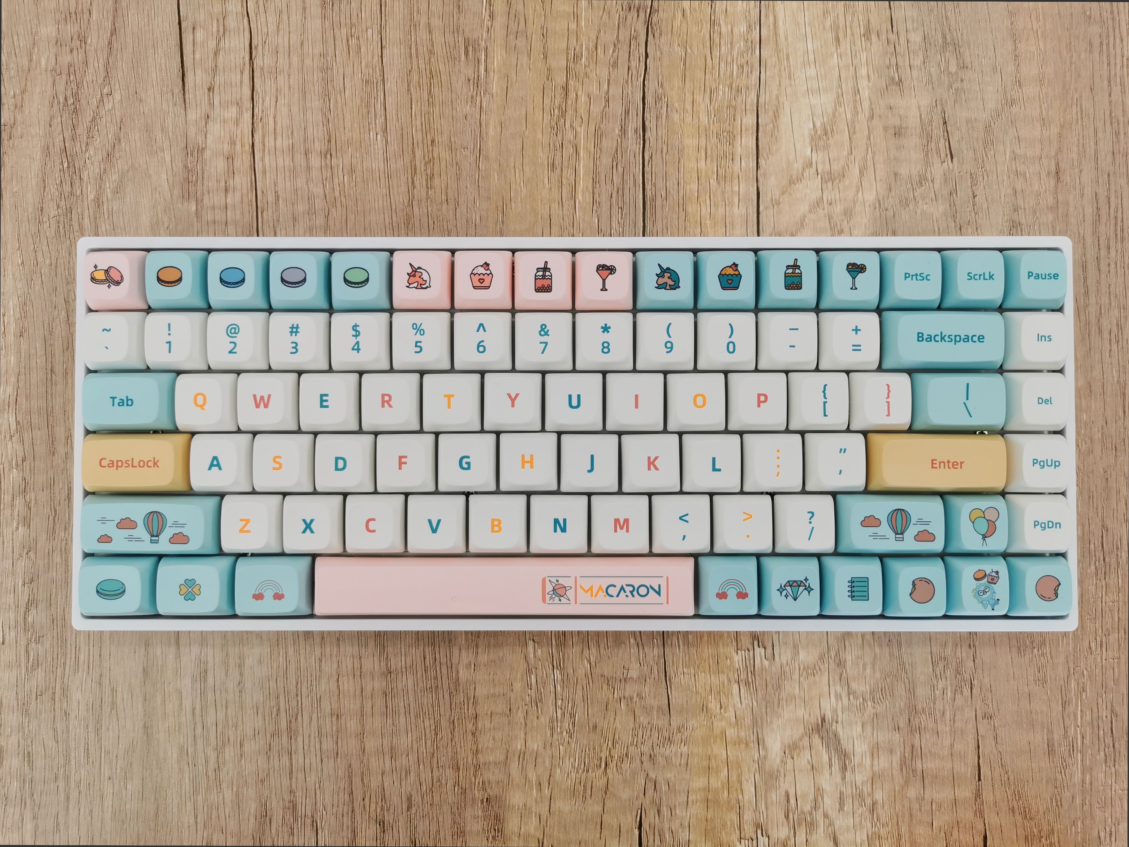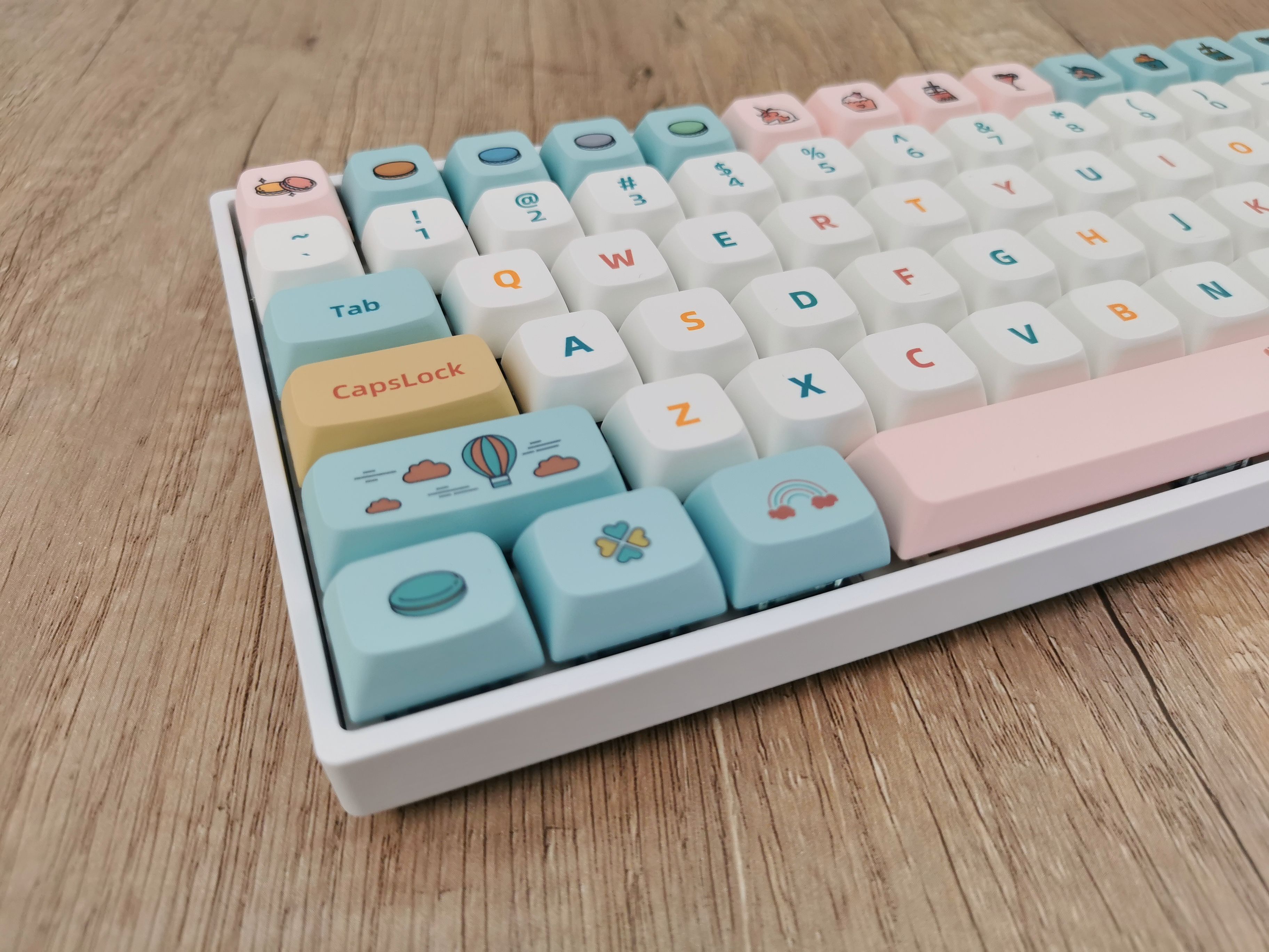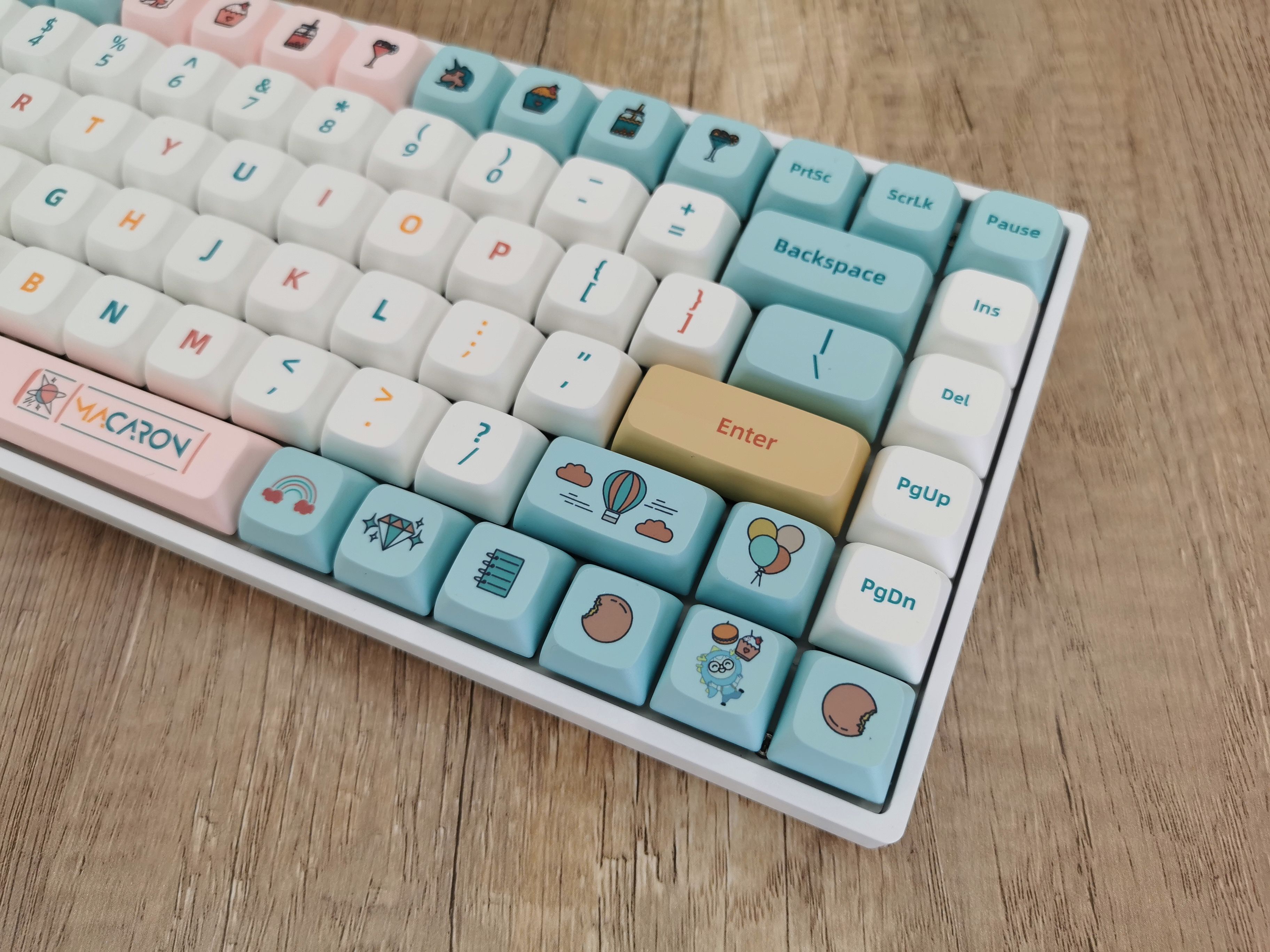 开箱后,直接被这套马卡龙配色的键帽戳中了少女心,这也太可爱了吧!马卡龙咱没吃过,但是第一反应就是想起了小时候吃的各种棉花糖……