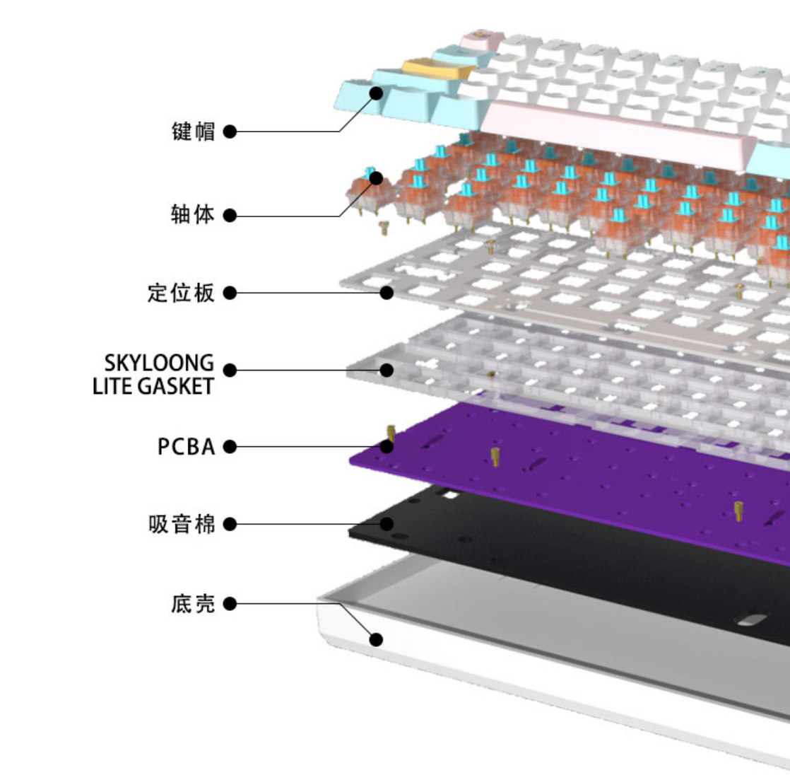 小呆虫这把键盘使用了GASKET结构,最早是在键盘客制化圈子里小范围使用的,现在被发扬光大到量产产品上了。