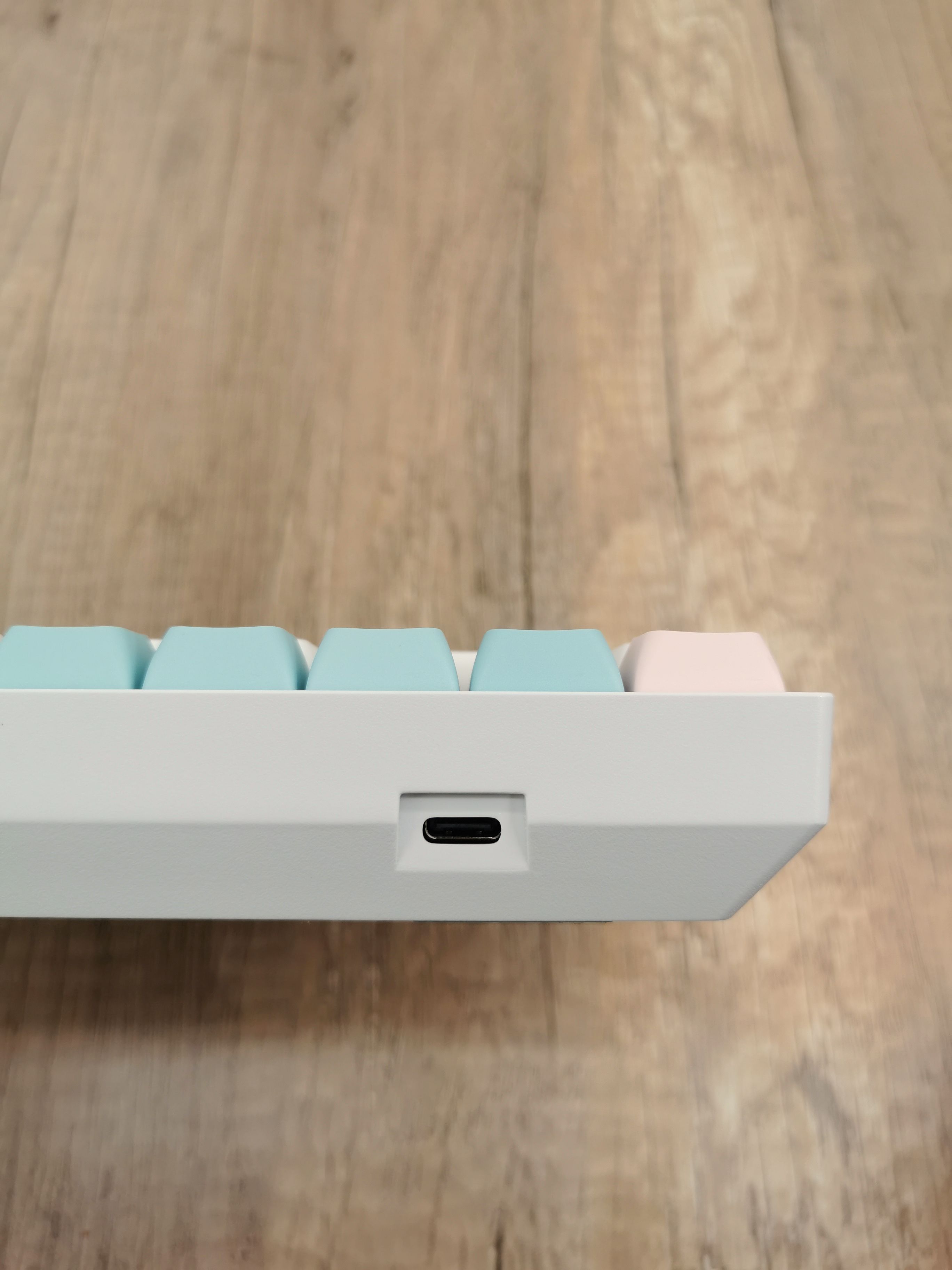 近距离拍照,可以看到键帽真的漂亮,而且圆润的形状不仅更加增强了卡哇伊风格,而且键帽的角度与弧度都很舒服,打字的时候也不容易误触。