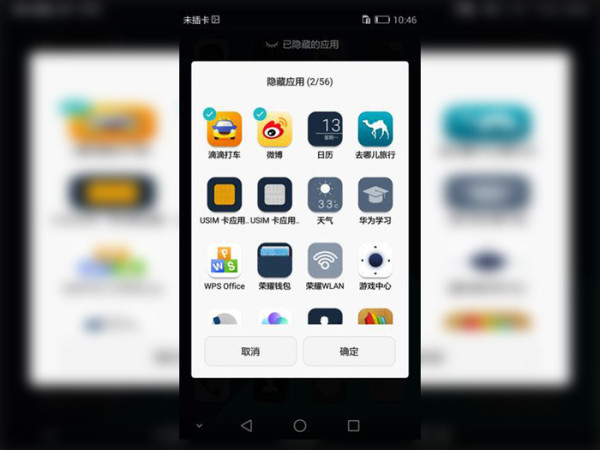 3、点击需要恢复显示的应用,一般隐藏了的应用左上角会有一个【√】,选择好之后点击【确定】,回到桌面即可看到隐藏的应用图标已经恢复;