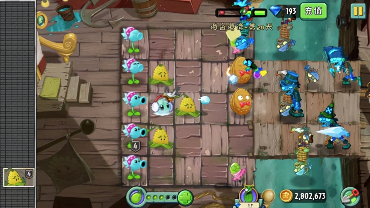 先看一下僵尸阵营由海盗巨人僵尸领衔除了小鬼僵尸炮其他海盗港湾的僵尸齐聚一堂此情此景可谓压迫感拉满而我们传送而来的植物相对来说种类不是很多有寒冰射手、玉米投手两大主攻以及冰冻生菜、弹簧豆、坚果三大辅助