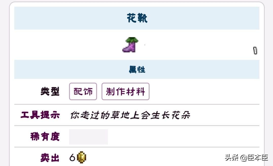 工具,草药收割机,用来收草药可以获得额外收益并且不会伤害到未成熟的草药。哦对了还能在泥土上种草皮。花靴