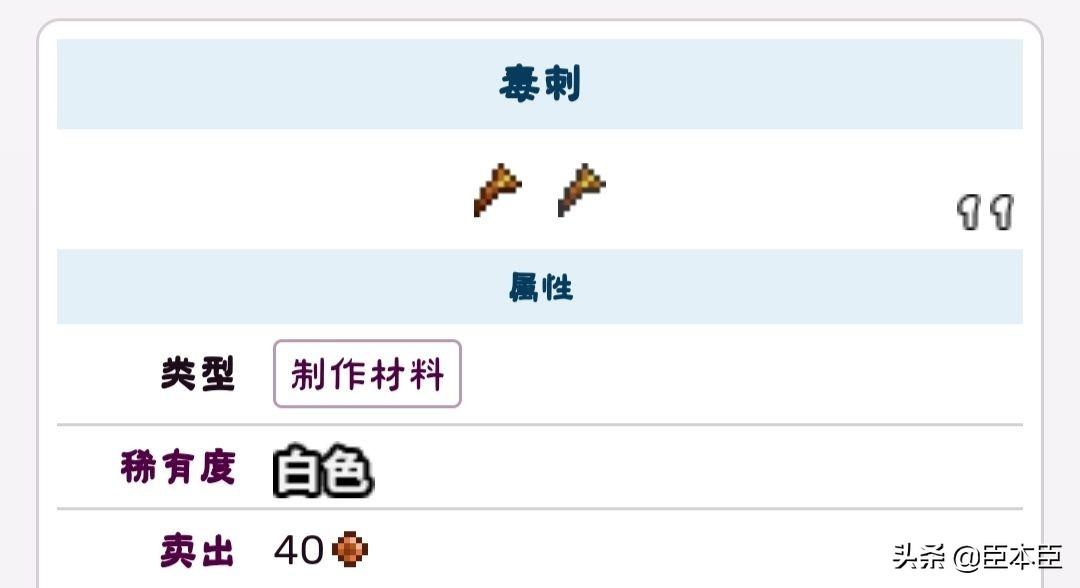 生长在丛林洞穴层,发出明亮的绿色光芒。使用武器挥击即可掉落。★毒刺