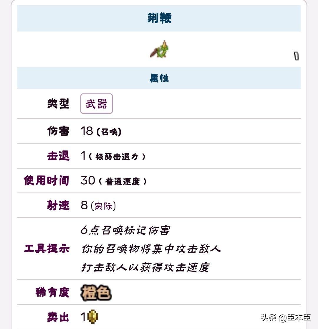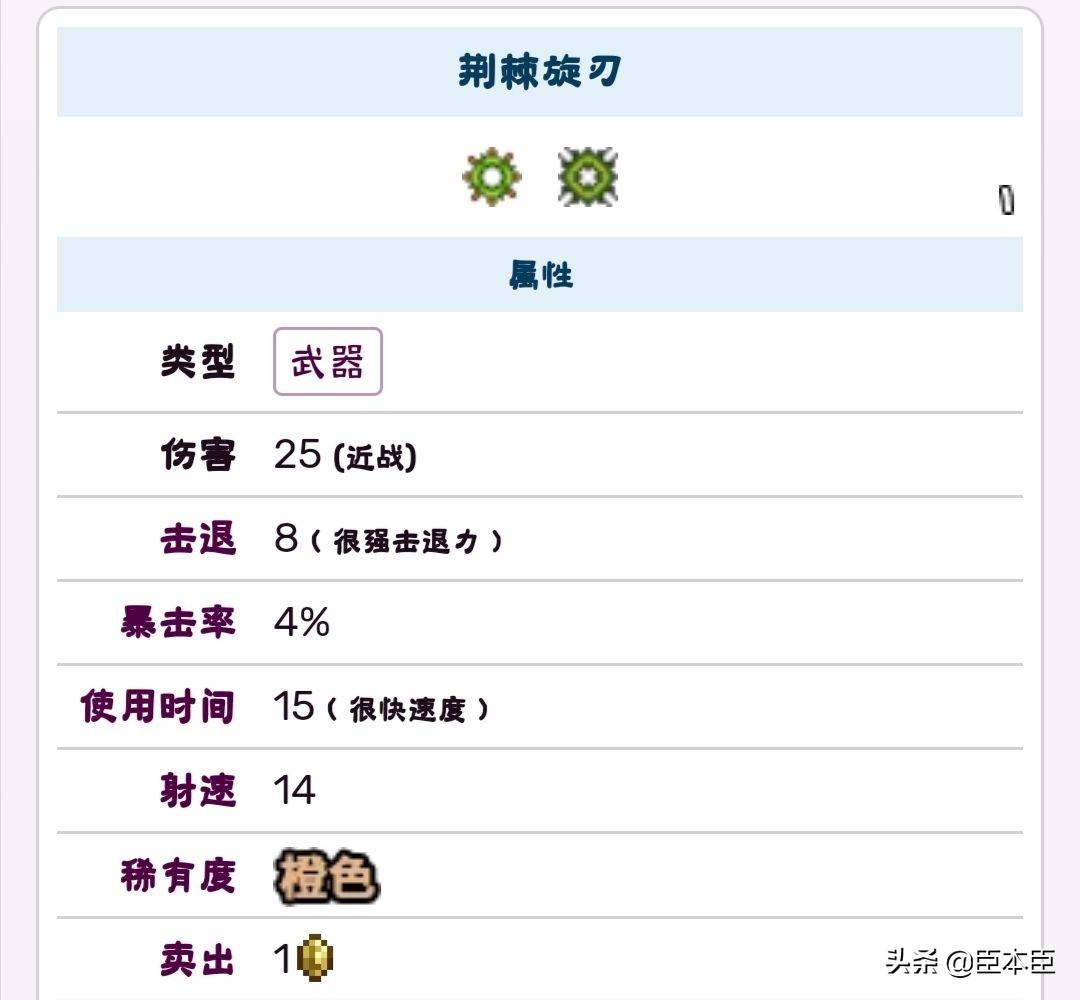 近战武器,在大小上有些许优势,击退还行,在对付成群敌怪时效果很好,是制作永夜之刃的材料之一。荆棘旋刃