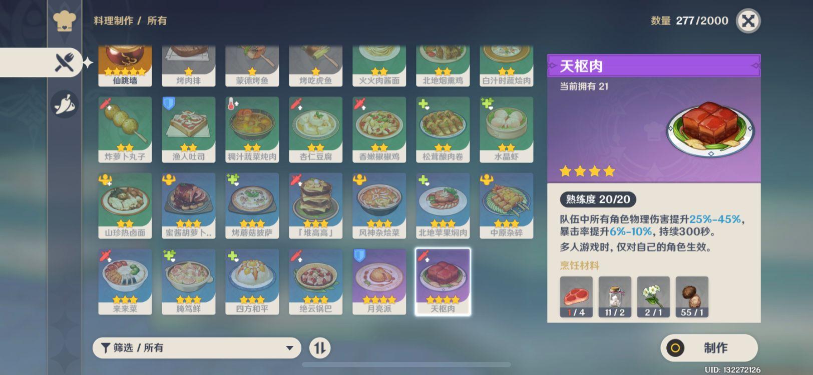 烤肉排、摩拉肉、蒙德烤鱼、爆炒肉片、金丝虾球