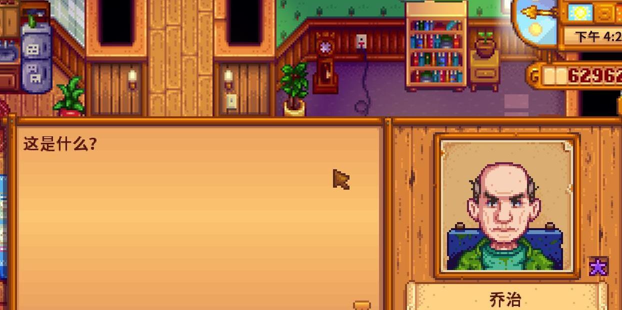 将“星露谷玫瑰”交给桑迪后,玩家会获得一个“高级电视遥控器”,整天都在看电视的只有乔治了。拿着“高级电视遥控器”直接找到乔治。