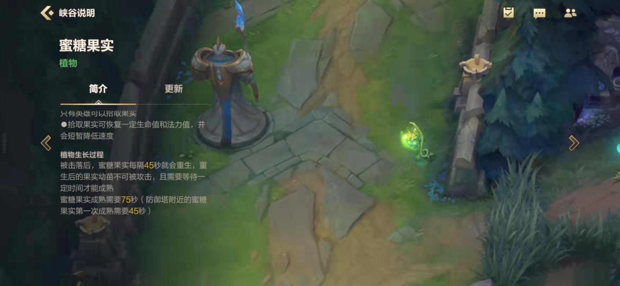 蜜糖果实每隔45s重生,除了防御塔附近的第一次成熟时间是45s,其它时候都需要75s;